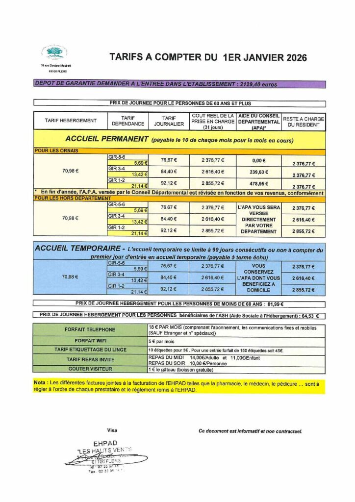 Ce tarif recouvre l’ensemble des prestations d’administration générale, d’accueil hôtelier, de restauration, d’entretien et d’animation de la vie sociale de l’établissement qui ne sont pas liées à la perte d’autonomie des personnes accueillies.